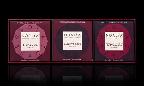 NOALYA cioccolato coltivato_FERVOLATO logo, struttura tavoletta e packaging